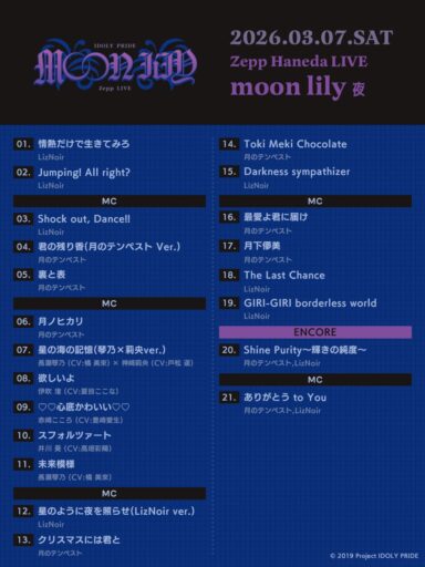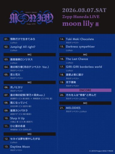 3/7に開催された「LAWSON presents IDOLY PRIDE Zepp Haneda LIVE moon lily」に参加してきました。以下はただの日記です。