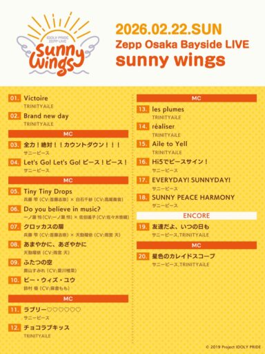 2/22に開催された「LAWSON presents IDOLY PRIDE Zepp Osaka Bayside LIVE sunny wings」に参加してきました。以下はただの日記です。